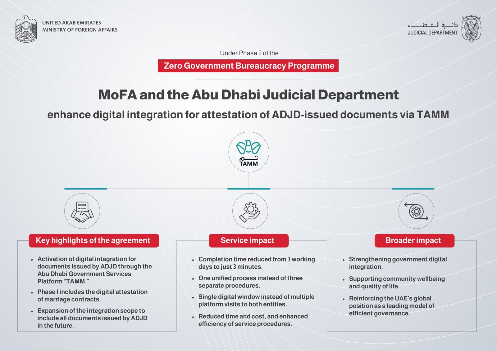 The Abu Dhabi Judicial Department (ADJD) and the Ministry of Foreign Affairs (MoFA) have signed a Memorandum of Understanding to activate the integration of digital attestation for documents issued by the Department through the Abu Dhabi Government Services Platform “TAMM”, as part of the second phase of the Zero Government Bureaucracy Programme.