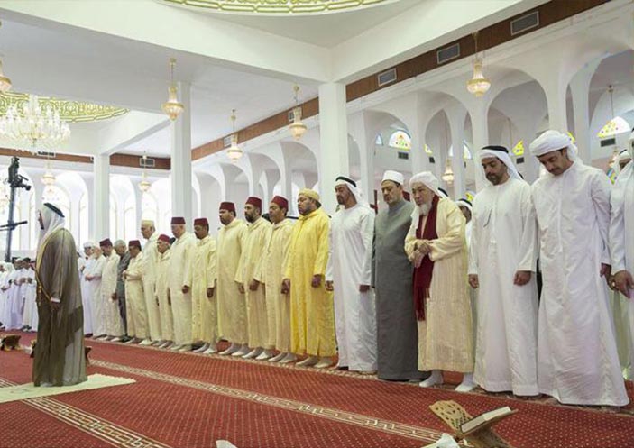 وأدى الصلاة الى جانبهما فضيلة الامام الأكبر الدكتور احمد الطيب شيخ الأزهر الشريف وفضيلة الشيخ عبدالله بن بيه رئيس منتدى تعزيز السلم في المجتمعات المسلمة وصاحب السمو الملكي الامير مولاي رشيد وسمو الشيخ حامد بن زايد آل نهيان رئيس ديوان ولي عهد ابوظبي وسمو الشيخ عبدالله بن زايد آل نهيان وزير الخارجية ومعالي الشيخ نهيان بن مبارك آل نهيان وزير الثقافة والشباب وتنمية المجتمع .