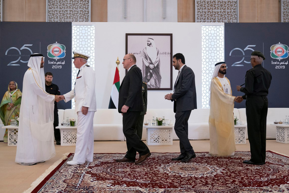 استقبل صاحب السمو الشيخ محمد بن راشد آل مكتوم نائب رئيس الدولة رئيس مجلس الوزراء حاكم دبي "رعاه الله" وصاحب السمو الشيخ محمد بن زايد آل نهيان ولي عهد أبوظبي نائب القائد الأعلى للقوات المسلحة في القاعة الرئيسية في مركز أبوظبي الوطني للمعارض القيادات السياسية والعسكرية والمشاركين في فعاليات معرضي الدفاع الدولي " آيدكس" والدفاع البحري " نافدكس" 2019 التي انطلقت اليوم في العاصمة أبوظبي.