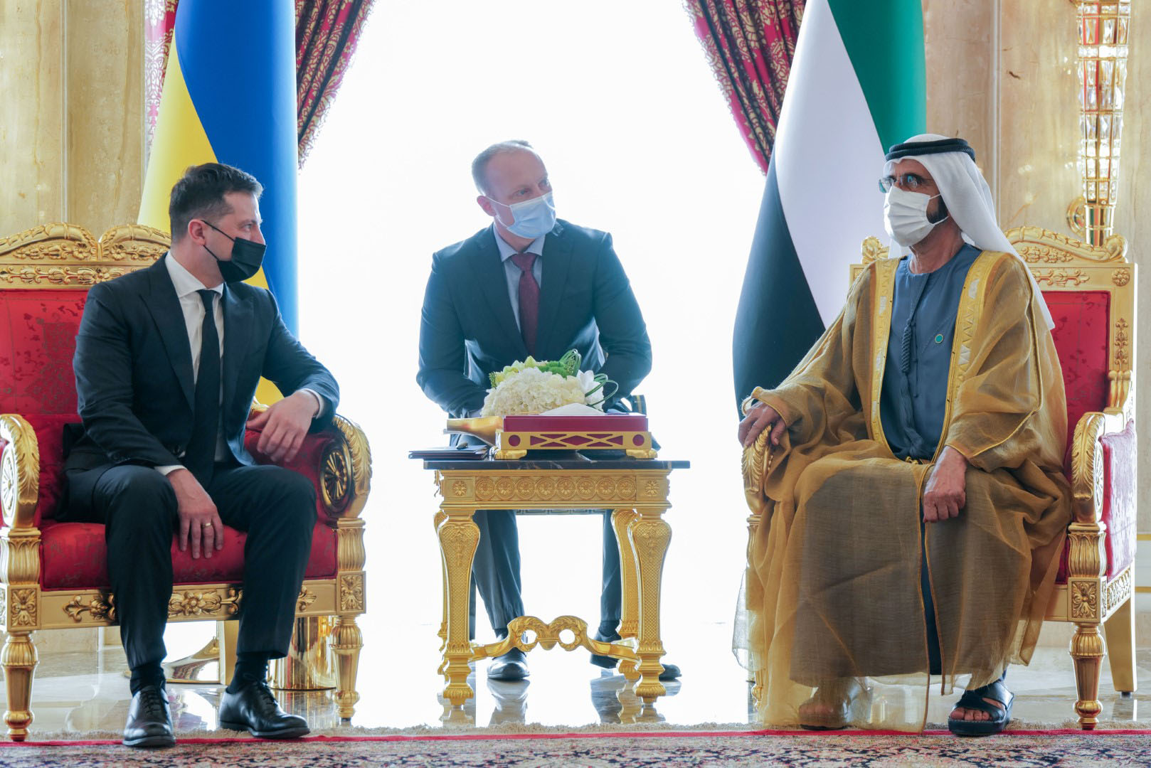 استقبل صاحب السمو الشيخ محمد بن راشد آل مكتوم نائب رئيس الدولة رئيس مجلس الوزراء حاكم دبي "رعاه الله" في قصر سموه بزعبيل ظهر اليوم فخامة الرئيس فلاديمير زيلينسكي رئيس جمهورية أوكرانيا يرافقه وفد وزاري وحكومي رفيع.