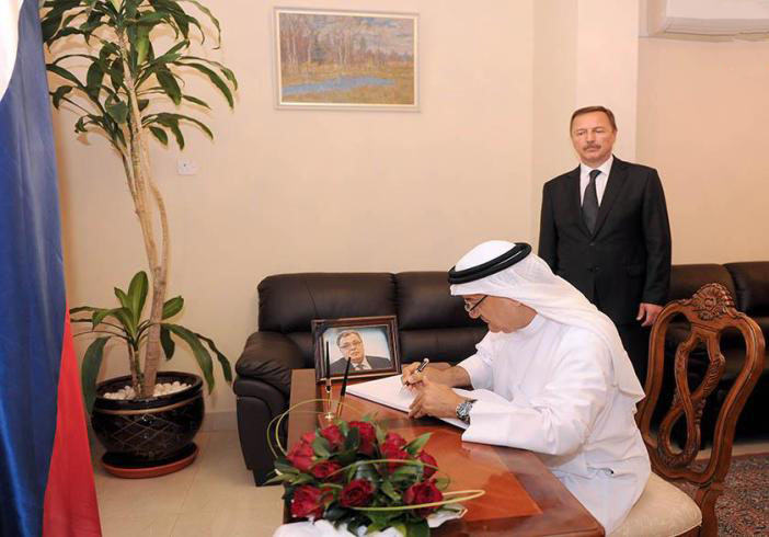 قدم معالي سهيل بن محمد فرج فارس المزروعي وزير الطاقة وسعادة أحمد عبدالرحمن الجرمن مساعد وزير الخارجية والتعاون الدولي للشؤون السياسية..واجب العزاء إلى سعادة الكسندر يفيموف سفير جمهورية روسيا الإتحادية لدى الدولة في حادثة اغتيال اندريه كارلوف السفير الروسي لدى تركيا .