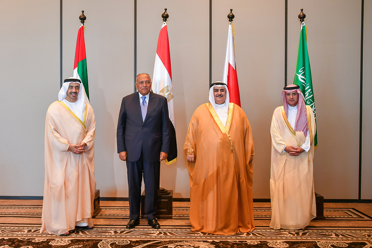 // اجتمع وزراء خارجية كل من المملكة العربية السعودية وجمهورية مصر العربية ومملكة البحرين والإمارات العربية المتحدة في المنامة يوم 30 يوليو 2017 في إطار التشاور المستمر حول أزمة قطر وضرورة إيقاف دعمها وتمويلها للإرهاب وتهيئتها الملاذ الآمن للمطلوبين قضائياً لدى دولهم والمتورطين في الإرهاب وتمويله ونشرها لخطاب الكراهية والتحريض وتدخلاتها في شؤون المنطقة.
