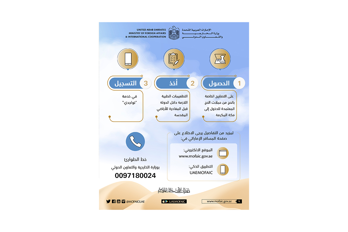 تؤكد وزارة الخارجية والتعاون الدولي على مواطني دولة الإمارات أهمية التخــطيط المسبق قبل السفر لأداء مناسك الحج من خلال الاطلاع على إرشادات السفر في صفحة المسافر الإماراتي والمتوفرة في موقع الوزارة ومراجعة اشتراطات وإجراءات الدخول إلى المملكة العربية السعودية.