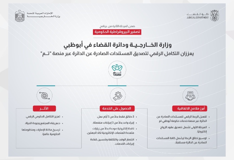 ضمن برنامج تصفير البيروقراطية الحكومية.. "الخارجية" و"قضاء أبوظبي" يُعززان التكامل الرقمي لتصديق المستندات الصادرة عن الدائرة عبر منصة "تم"