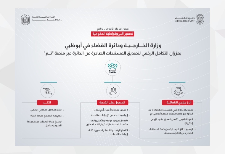 ويأتي الربط الإلكتروني بين دائرة القضاء أبوظبي ووزارة الخارجية في إطار برنامج تصفير البيروقراطية الحكومية في مرحلته الثانية، الذي يواصل إرساء منظومة عالمية رائدة في العمل الحكومي، أساسها توفير خدمات أكثر كفاءة وأكثر جودة وأكثر فاعلية وأبعد أثرًا في المجتمع.