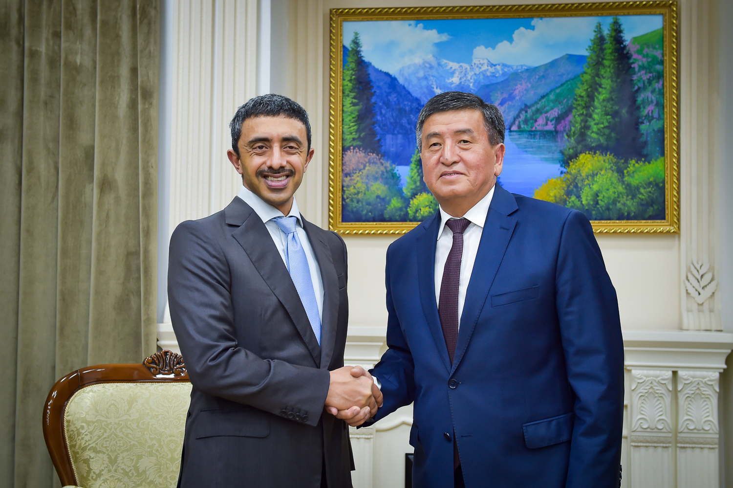 The Prime Minister of Kyrgyzstan, Sooronbay Jeenbekov, received H.H. Sheikh Abdullah bin Zayed Al Nahyan, Minister of Foreign Affairs and International Cooperation and his accompanying delegation on Wednesday.