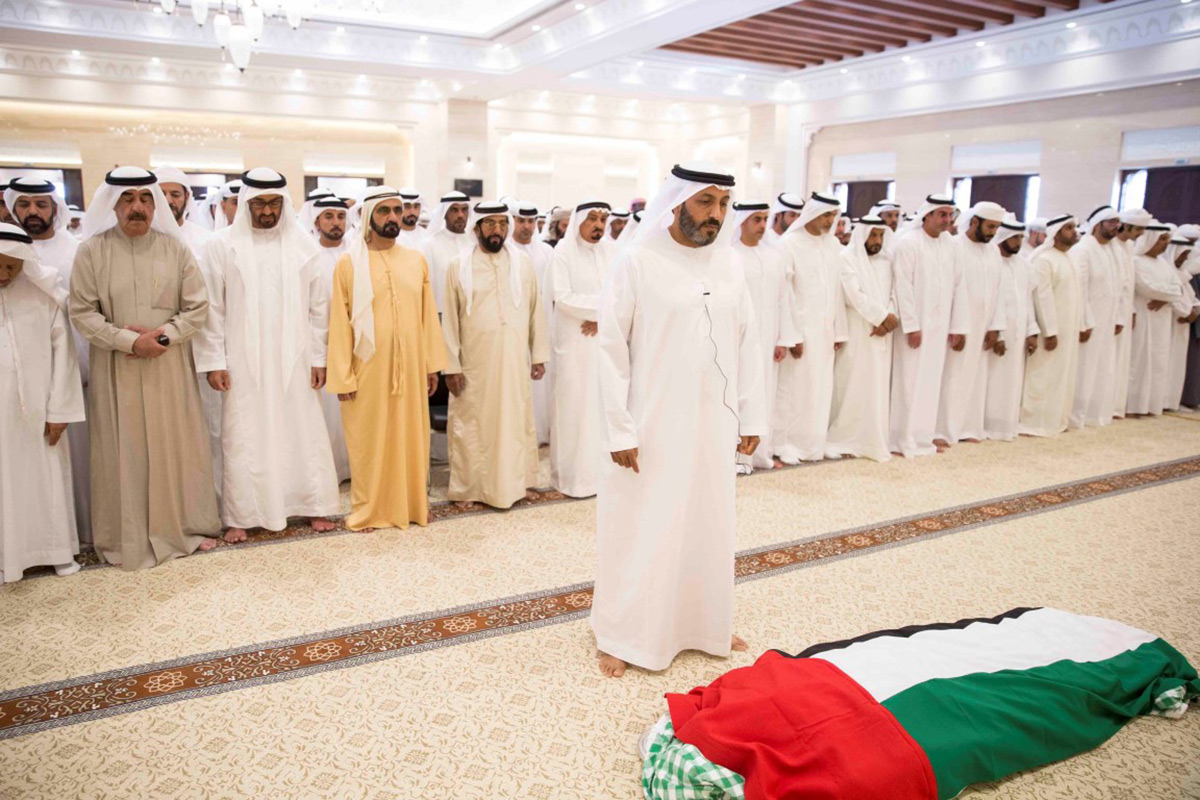 Attending the funeral prayer were H.H. Sheikh Humaid bin Rashid Al Nuaimi, Supreme Council Member and Ruler of Ajman; H.H. Sheikh Saud bin Rashid Al Mu'alla, Supreme Council Member and Ruler of Umm Al Qaiwain; H.H. Sheikh Sultan bin Zayed Al Nahyan, the President's Representative; H.H. Sheikh Hamdan bin Rashid Al Maktoum, Deputy Ruler of Dubai and UAE Minister of Finance; H.H. Sheikh Maktoum bin Mohammed bin Rashid Al Maktoum, Deputy Ruler of Dubai; H.H. Sheikh Tahnoun bin Mohammed Al Nahyan, Abu Dhabi Ruler`s Representative in Al Ain Region; H.H.Sheikh Surour bin Mohammed Al Nahyan; H.H. Sheikh Nahyan bin Zayed Al Nahyan, Chairman of the Board of Trustees of Zayed bin Sultan Al Nahyan Charitable and Humanitarian Foundation; H.H. Lt. General Sheikh Saif bin Zayed Al Nahyan, Deputy Prime Minister and Minister of the Interior; H.H. Sheikh Hamed bin Zayed Al Nahyan, Chief of the Abu Dhabi Crown Prince's Court; H.H. Sheikh Omar bin Zayed Al Nahyan, Deputy Chairman of the Board of Trustees of Zayed bin Sultan Al Nahyan Charitable and Humanitarian Foundation; H.H. Sheikh Khalid bin Zayed Al Nahyan Chairman of the Board of Zayed Higher Organisation for Humanitarian Care and Special Needs, ZHO; H.H. Dr. Sheikh Sultan bin Khalifa Al Nahyan, Adviser to the UAE President; H.H. Sheikh Mohammed bin Khalifa Al Nahyan, Executive Council Member; H.H. Sheikh Ahmed bin Saeed Al Maktoum, Chairman of Dubai Civil Aviation Authority and Chief Executive of Emirates Group; H.H.Sheikh Saeed bin Mohammed bin Rashid Al Maktoum; Sheikh Nahyan bin Mubarak Al Nahyan, Minister of Tolerance; Sheikh Sultan bin Tahnoon Al Nahyan, Member of the Executive Council; Pilot Staff-Brigadier Sheikh Ahmed bin Tahnoun bin Mohammed Al Nahyan, Chairman of the National and Reserve Service Authority; Rear Admiral Pilot Sheikh Saeed bin Hamdan bin Mohammed Al Nahyan, Deputy Commander of the Naval Forces; Sheikh Hazza bin Tahnoun Al Nahyan, Under-Secretary of the Ruler's Representative in Al Ain Region; and Sheikh Zayed bin Tahnoun Al Nahyan.