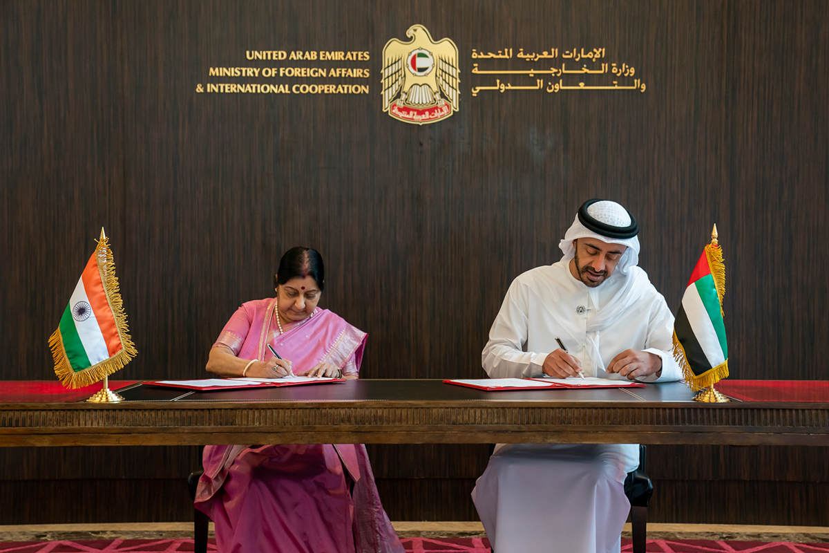 At the conclusion of the meeting, the two Foreign Ministers signed the Minutes of the 12th session of the UAE-India Joint Commission Meeting. They also witnessed the signing of a Memorandum of Understanding for Development Cooperation in Africa between the Ministry of Foreign Affairs and International Cooperation of the United Arab Emirates and the Ministry of External Affairs of the Republic of India. The MoU was signed by Sultan Mohammed Al Shamsi Assistant Minister for International Development at the UAE Ministry of Foreign Affairs and International Cooperation, and T. S. Tirumurti, Secretary for Economic Affairs at the Indian Ministry of External Affairs.