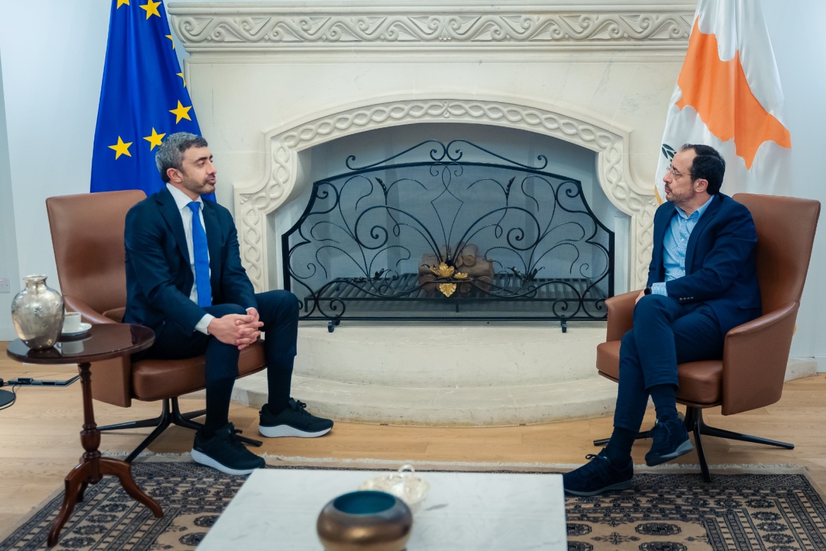 President Nikos Christodoulides of the Republic of Cyprus received H.H. Sheikh Abdullah bin Zayed Al Nahyan, Deputy Prime Minister and Minister of Foreign Affairs, during a working visit to Nicosia, in the presence of Dr. Constantinos Kombos, Cypriot Minister of Foreign Affairs.